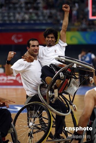 9月7日,北京殘奧會輪椅籃球首日比賽中,伊朗隊以73比62的比分戰(zhàn)勝南非隊。中新社發(fā) 杜洋 攝