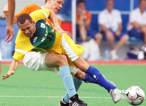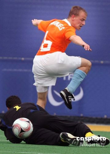 北京殘奧會七人制(男子)足球比賽9月8日在北京奧林匹克公園內(nèi)的橄欖球場開賽,在一場焦點(diǎn)比賽中,實(shí)力強(qiáng)大的巴西隊與荷蘭隊遭遇,最后巴西隊以1比0擊敗荷蘭隊。圖為巴西隊11號若澤·吉馬良斯突破防線后被人高馬大的荷蘭隊5號后衛(wèi)喬伊·門斯放倒。殘奧會七人制(男子)足球比賽在橄欖球賽場舉行,全場共60分鐘,隊員為腦癱患者。中新社發(fā) 任晨鳴 攝