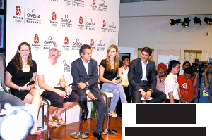 菲爾普斯(左二)到歐米茄展區(qū)參加活動,隨衛(wèi)隊員在一旁警衛(wèi)