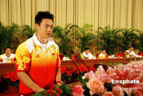 圖:體操個人全能冠軍楊威在報告會上發(fā)言