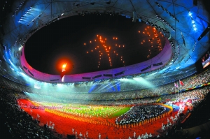 晚上8時整,燈光漸暗,數(shù)百發(fā)焰火劃破“鳥巢”夜空,一曲激昂歡快的樂曲拉開閉幕式序幕。