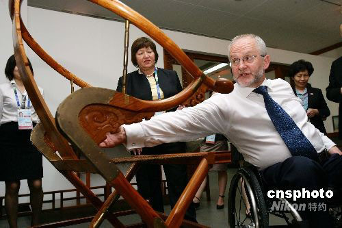 9月18日,酷愛中國傳統(tǒng)文化的國際殘奧委會主席菲利普·克雷文偕夫人到中國紫檀博物館參觀,仔細觀看珍貴的黃花梨木交椅,并向全國政協(xié)委員、中國紫檀博物館館長陳麗華女士致謝。北京殘奧會期間,中國紫檀博物館提供紫檀家具,在克雷文夫婦下榻的港澳中心專門布置了充滿濃郁中國傳統(tǒng)文化特色的會客廳、辦公室。中新社發(fā) 毛建軍 攝