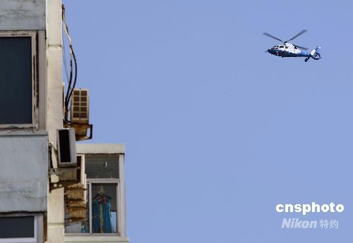 圖:直升機(jī)盤旋北京上空實(shí)時(shí)直播奧運(yùn)男子馬拉松賽事