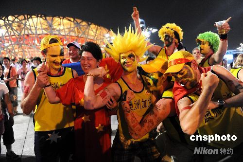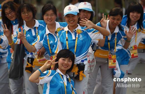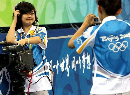 圖:北京奧運(yùn)會(huì)志愿者依依惜別籃球館