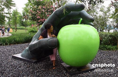 圖:游客與奧林匹克公園內(nèi)雕塑“親密”合影