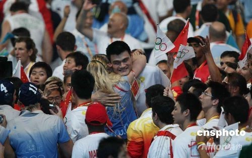 圖:奧運(yùn)會(huì)閉幕式姚明友好擁抱金發(fā)美女
