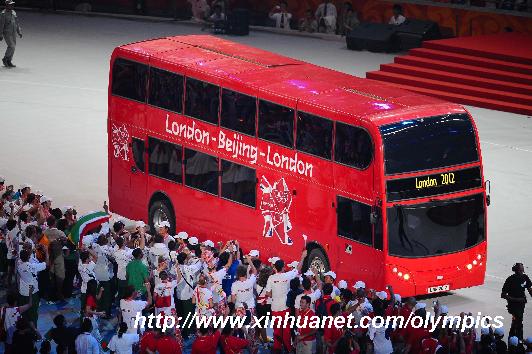 圖:倫敦巴士開進(jìn)閉幕式會(huì)場