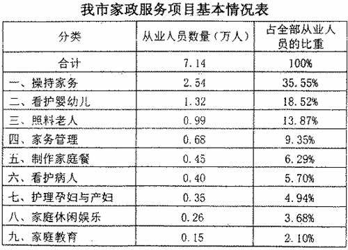 家庭服務業(yè)是以家庭為服務對象,以家庭各種事務為服務內容的第三產(chǎn)業(yè),主要包括家庭服務、維修服務、社區(qū)導購、房屋租售、人才招聘、法律服務、生活百事等七大類服務內容,涉及千家萬戶。目前,沈陽有從事該行業(yè)的各類家政服務企業(yè)558個,現(xiàn)有家政服務從業(yè)人員約7.14萬人,而社會對家政服務人員的需求則達到11萬人。家庭服務業(yè)成了當前和今后一個時期促進就業(yè)的一條重要渠道。