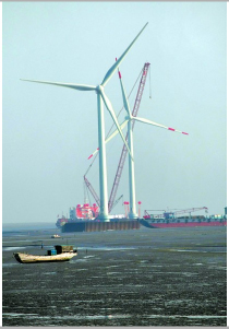 10月20日上午,隨著中國(guó)國(guó)電集團(tuán)公司總工程師張宗富一聲令下,龍?jiān)唇K如東海上(潮間帶)試驗(yàn)風(fēng)場(chǎng)首批兩臺(tái)各1.5兆瓦風(fēng)力發(fā)電機(jī)組在距海岸線3公里的南通市如東縣南黃海環(huán)港外灘上緩緩啟動(dòng),電流立即匯入江蘇省電網(wǎng)。至此,中國(guó)首批海上風(fēng)力發(fā)電機(jī)成功并網(wǎng)發(fā)電,中國(guó)風(fēng)能由此跨入藍(lán)色海洋時(shí)代。