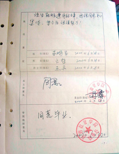 學籍登記表上寫著“同意畢業(yè)”