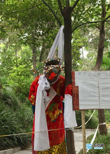 身穿大紅袍,頭戴金冠,脖子套在白布綾挽成的結(jié)上。7月23日下午16時許,鄭州市紫荊山公園內(nèi)一棵大樹下,一男子扮成一“財(cái)神爺”模樣欲“上吊”尋短見討回農(nóng)民工血汗錢。