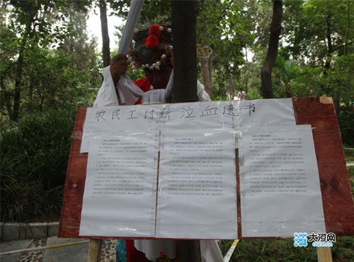 記者在現(xiàn)場看到,“財(cái)神爺”旁邊還放著一塊寫著“農(nóng)民工討薪泣血遺書”的木板。上面寫著“誰想死?螻蟻尚且貪生。但我也是被逼無奈,錢我討不到,房租要交,妻母要生活,工人要工資,可老板拿我當(dāng)球踢,我咨詢過很多部門,可都幫不了我,我活得太累了,可死,我也要讓黑心的老板們明白些什么?為了生活,我已經(jīng)向朋友借了九千多元的債,我的大孫女今年才三歲半,她幾乎天天都在告訴我;‘爺爺,我要上學(xué)’,每當(dāng)聽見這句話,我的心都快碎了,二孫女才二十個月,雖然還不知道向爺爺要求什么,但孩子一天天大了,也要上學(xué)了。