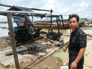昨天上午11時許,記者與梁先生一同到現(xiàn)場了解情況。梁先生的金江沙場位于定安定城鎮(zhèn)和?谛缕骆(zhèn)交界處,已經(jīng)暫停作業(yè),工人們在工棚休息。記者在采沙船被毀現(xiàn)場看到,采沙船擱淺在岸邊,采沙機器完全被毀,電池燒焦,木板千瘡百孔,表面被大火熏得烏黑,內部零件完全破壞。雖然距離案發(fā)已有10余天,當時大火熊熊燃燒的情景依然可以想見。