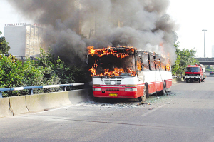早8點(diǎn)35分,北京市東南三環(huán)華威橋南側(cè)一輛638路公交車發(fā)生自燃,司機(jī)在發(fā)現(xiàn)危險(xiǎn)情況后立即將公交車?枯o路安全地帶,疏散車內(nèi)乘客,并報(bào)警,8時(shí)50分,公交車大火被消防員迅速撲滅。