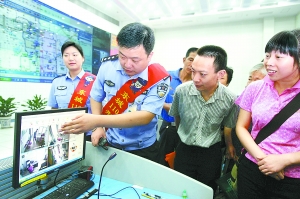居民們對(duì)指揮中心的大屏幕倍感興趣,兩位東城“110”民警形象大使向他們演示了指揮中心如何通過系統(tǒng)指揮“110”警車到達(dá)現(xiàn)場(chǎng)接處警!懊刻炀榉譃4級(jí),3級(jí)以上的警情,指揮中心可在第一時(shí)間直接指揮調(diào)動(dòng)警車,通過GPS定位,指揮最近的巡邏車組去現(xiàn)場(chǎng),然后再通過探頭查看現(xiàn)場(chǎng),確保3級(jí)以上警情,警車5分鐘就能到達(dá)現(xiàn)場(chǎng)!毙蜗蟠笫垢稄(qiáng)警官介紹。