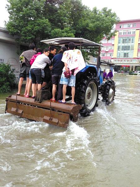 臺(tái)風(fēng)“菲特”帶來(lái)的強(qiáng)降雨致使道路成了洼地,過(guò)路成了“過(guò)河”,給人們出行帶來(lái)極大的不便。昨天,鄞州橫溪鎮(zhèn)的小伙子張超,特地開(kāi)著自家耕田用的拖拉機(jī),來(lái)回載著村民們進(jìn)出村里。
