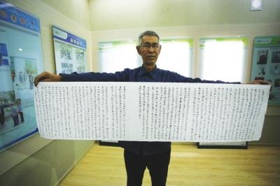 這幅書法長卷巨作,一字字、一句句,凝結(jié)著對黨的感恩。它的作者蘆臨鳳說:“雖然我不是黨員,但是我知道是誰讓農(nóng)人翻身,是誰讓我們吃上了甜水,我寫這幅長卷黨史,就是想感謝我們的黨,讓黨史告訴如今的幸福生活是怎么來的!”