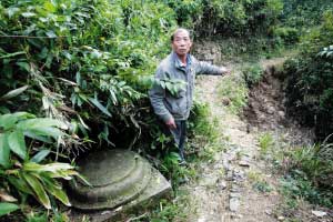 “竹子一砍掉后,一個(gè)巨大的房柱石地盤就露了出來,顏色有些發(fā)青。坍塌的坑里有很多青瓦!