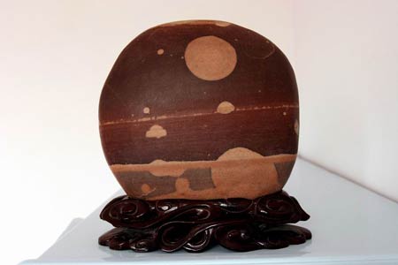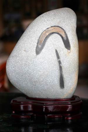 無獨有偶,當日下午1時許,記者在西固區(qū)河口鎮(zhèn)的張先生家中也看到了一塊類似的黃河奇石,不同的是該黃河石的體形稍大,呈淡褐色,黃河石正面上部有一個直徑約4厘米的銀色滿月,滿月的左下方有一顆衛(wèi)星在做繞月飛行,而且繞月軌道清晰可見。張先生告訴記者,大約一年前,他從一位石友處發(fā)現(xiàn)了這塊黃河石,當時覺得挺普通,并沒在意。最近電視、報紙連續(xù)報道“嫦娥”奔月的相關消息,他突然發(fā)現(xiàn)這塊黃河石頗似衛(wèi)星升空后繞月飛行的場景,便從那位石友處高價購得。(記者 王少丹)
