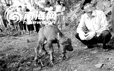 這頭牛犢是該村村民符明江家里的母牛生的。據(jù)符明江介紹:他家那只母牛是一頭水牛,已養(yǎng)了2年多時(shí)間。母牛懷孕10個(gè)月,這是它的第一胎。