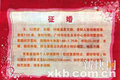 昨日記者走訪了與該征婚廣告有聯(lián)系的幾家廣告公司后獲得證實(shí):征婚女子真實(shí)存在,而且確實(shí)是廣州本地人。不過幾大報(bào)社接手該征婚廣告單的業(yè)務(wù)員們均未見過該女子。