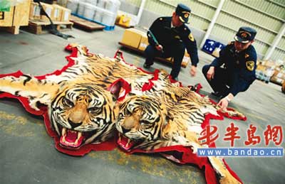 得到線索后,海關緝私部門立即趕赴煙臺,到黃某的暫住地進行搜查,執(zhí)法人員共搜出虎皮一張,虎鞭、虎膽、虎牙制品各一件,虎骨若干。加上執(zhí)法人員9月21日查扣的那張虎皮,涉案總額達100萬元。同時,執(zhí)法人員將另一名涉案的中國籍犯罪嫌疑人抓獲。