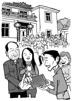 “干爹”身材敦厚壯實(shí),笑盈盈遞過(guò)一只紅包:“恭喜恭喜!這是我的見(jiàn)面禮,一點(diǎn)小心意,拿不出手,請(qǐng)你們收下!”
