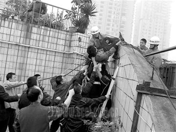記者趕到現(xiàn)場時,正當消防戰(zhàn)士準備著手解救該男子。記者看到,現(xiàn)場有數(shù)百居民圍觀。跳樓男子站在一7層高樓樓頂外側(cè)的巨幅廣告牌鋼架上,樓下警方拉起了警戒線。幾名身系保險繩的消防戰(zhàn)士從該樓樓頂慢慢攀爬上了巨幅廣告牌鋼架。驚心動魄的一刻終于發(fā)生了,消防戰(zhàn)士將該男子拉住,并用隨身攜帶的安全繩縛住男子身體,將男子從鋼架轉(zhuǎn)移至樓頂,整個解救過程,歷時40余分鐘。