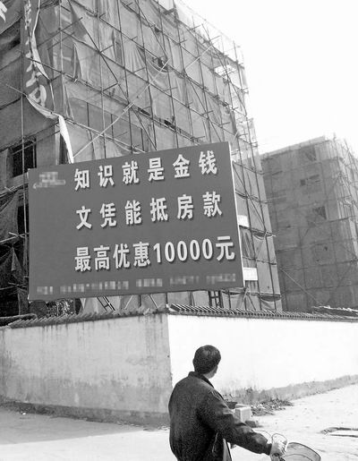 數(shù)十平方米的3塊巨大廣告牌,位于漯河市嵩山路南段與湘江路西段交叉口,緊鄰的是一幢幢正在拔地而起的住宅樓。記者看到,廣告牌上寫著“知識就是金錢、文憑能抵房款、最高優(yōu)惠10000元”等字樣(如圖)。這一做法,引發(fā)眾多圍觀者的熱議。