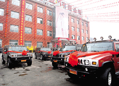 上午十點左右,迎親車隊出發(fā)。婚車車隊在路上排起了長龍,其中有12輛悍馬,龍鳳彩車走在最前面。據(jù)一位司機講,每輛彩車的裝修費用都高達6萬元。彩車因為經(jīng)過外部裝修視野不好,有專門的工作人員手持彩旗引導(dǎo)。