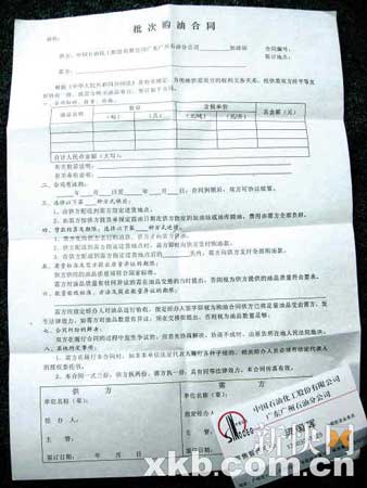 記者又問:“我們能不能簽合同呢?”葉站長說:“當(dāng)然可以簽。”隨后他當(dāng)場拿出一份《批次購油合同》,合同上的“供方”就是“中國石油化工股份有限公司廣東廣州石油分公司加油站”!斑@些都是正式合同,提貨單位也是我們公司的正式提貨單,發(fā)票也是正式發(fā)票,合作愉快最重要!比~站長說。