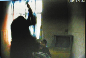 我馬上站起來,一只手跟他搏斗,一只手打開了防盜門,當時的動靜很大,外面接應的同事也都聽見了,他們砸門砸了五六下,門開了,沖進來就控制了周某。