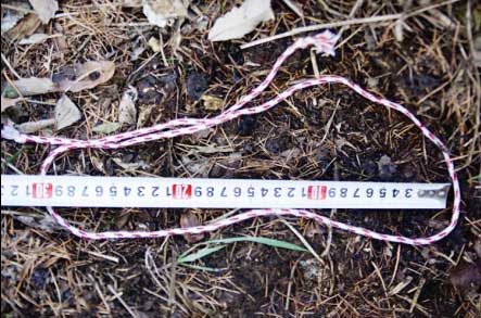 現(xiàn)場(chǎng)人員決定再?gòu)暮舆呏,查找可疑痕跡。調(diào)查人員發(fā)現(xiàn),在腳印左邊的灌木叢上,一根距地面1.2米高的樹(shù)枝擋住去路,其上3根小枝似乎被不明物體通過(guò)時(shí)絆動(dòng),因擠壓而折斷。地上有明顯不規(guī)則的連續(xù)腳印,步距1米多。在腳印繞過(guò)一塊大石頭的地方,他們發(fā)現(xiàn)落葉腐殖土上的一大一小、同向、前后相鄰的兩個(gè)腳印(非鞋印),且能夠分辨出均為左腳。由于時(shí)間有限,調(diào)查人員決定放棄用帶來(lái)的石膏灌制腳印模型,待后續(xù)處理。