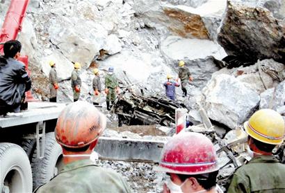 昨日凌晨4時,搜救人員發(fā)現(xiàn)了最不愿意看到的結(jié)果:該客車被崩塌現(xiàn)場的巨石所掩埋。