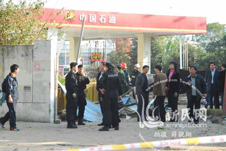 警察與消防人員接報后,迅速趕到現(xiàn)場展開搶救。報道稱,浦三路路面上都是水泥石塊,加油站附近的建筑物玻璃都被砸碎,路面交通已全面受阻。