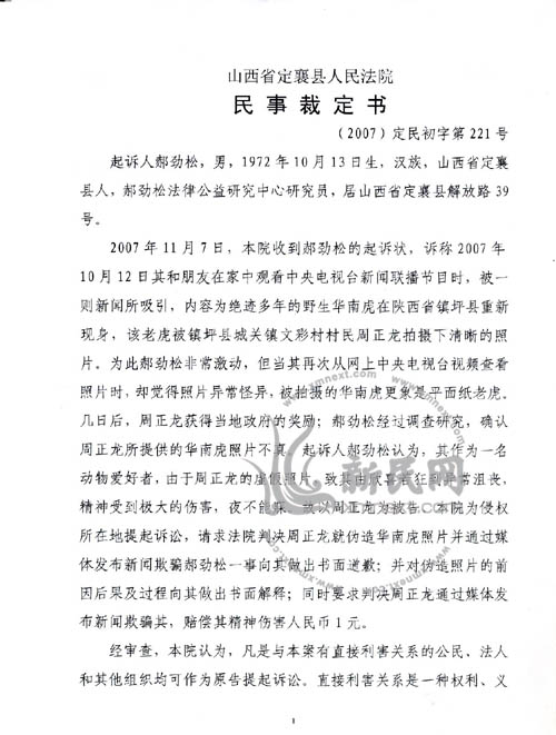 據(jù)媒體報(bào)道,郝勁松于11月7日正式向山西省定襄縣人民法院起訴“華南虎”拍攝者周正龍,按照民事訴訟法相關(guān)規(guī)定,在法定期限內(nèi),郝勁松沒(méi)有收到任何通知。11月28日,新民網(wǎng)連線郝勁松,他稱11月27日終于見(jiàn)到了定襄縣人民法院的民事裁定書(shū),法院對(duì)郝勁松的起訴不予受理。郝勁松向新民網(wǎng)表示,他將在法定期限內(nèi)向山西省忻州市中級(jí)人民法院提出上訴。