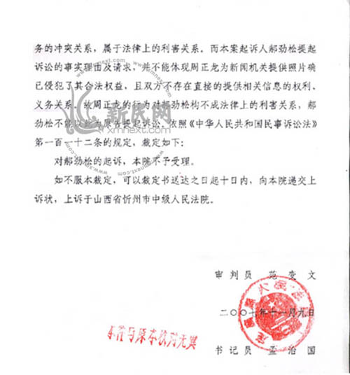 新民網(wǎng)從郝勁松提供的《山西省定襄縣人民法院民事裁定書(shū)》照片了解到,定襄法院不予受理的理由是:起訴人郝勁松提起訴訟的事實(shí)理由及請(qǐng)求,并不能體現(xiàn)周正龍為新聞機(jī)關(guān)提供照片確已侵犯了其合法權(quán)益,且雙方不存在直接的提供相關(guān)信息的權(quán)利、義務(wù)關(guān)系。故周正龍的行為對(duì)郝勁松構(gòu)不成法律上的利害關(guān)系,郝勁松不能以此為原告提起訴訟。