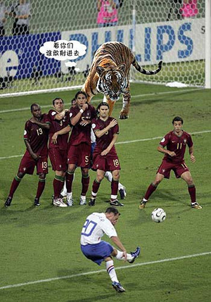 一些網(wǎng)友還為華南虎賦予“靈性”,讓它參與了激烈的足球賽,甚至做起了“門衛(wèi)”。在球賽版的PS照片中,華南虎成為了守門員,正“虎視眈眈”地盯著“對手”,甚至還威脅“看你們誰敢射進門”(網(wǎng)友設計臺詞),那場景讓人忍俊不禁。