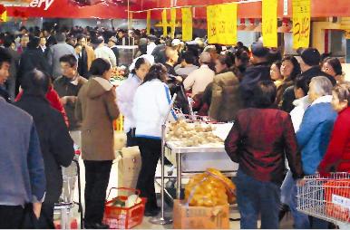 該超市人事部負(fù)責(zé)人李靜告訴記者,按照預(yù)定計劃,超市于22時在一樓大廳發(fā)放購買促銷面粉的小票,要求顧客持票購買。為了維持秩序,8名員工站成一排,彼此間距可容一人通過,老人們依次通過領(lǐng)取小票。
