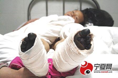 據楊二喜的姐姐楊銀蓮介紹,她們家住在西吉縣興盈鄉(xiāng)引黃溝村,那里常年干旱,家里的幾畝旱地是連年歉收,加上父親患有眼疾視物不清,母親神智低下,家庭生活非常困難。10年前,楊銀蓮嫁到了離家不遠的一個村子。今年11月24日早晨,她父親急急忙忙到她家尋找母親和弟弟,她才得知母親和弟弟在頭一天就不見了。得到這一消息,鄰居、親戚20多人到處尋找,可是找了兩天都沒有消息。經過商議,人們兵分幾路繼續(xù)尋找。11月26日,當人們找到離家數十公里的白城村時,一位老大爺說,11月25日,一個50多歲女人背著一個男孩在他家討過水喝。按照老大爺描述,證實這倆人正是他們苦尋多天的親人。11月27日,被困5晝夜的母親和弟弟終于在附近的一座山上找到了。楊銀蓮回憶說:“當時母親和弟弟正坐在一個土坑里,弟弟僅穿著一件薄毛衫,臉凍得發(fā)紫,鞋只剩下一只。弟弟看見我的第一句話便說‘大姐,我快凍死了”,回家后給弟弟換衣服時發(fā)現,弟弟的雙腳已凍成了黑色。楊二喜告訴記者:“媽媽背我出來要飯,不知不覺就迷了路,一只鞋也不知道啥時丟了,我的腳在出門的第二天便失去了知覺,這5天中,我們每晚都睡在草堆里,陪伴我的除了媽媽,就是饑渴和寒冷。”