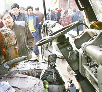 中午11時許,一輛拖車將該卡車拖走,卡車底下現(xiàn)出大量的燃燒殘存物。