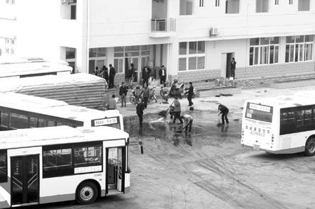 記者在現(xiàn)場附近一高樓上看到,停車場內(nèi)一角落邊停放著四輛公交車,有的車玻璃已碎裂,車上可明顯看到被火燒過的痕跡。場內(nèi)幾名工作人員推著板車在運一些烏黑的物體,十個人在幾輛公交車圍起的地方忙著清洗烏黑的地面,旁邊還停著一用塑料布包裹嚴實的物體。場內(nèi)有人發(fā)現(xiàn)記者在拍攝,又叫來一部公交車將清洗的地方圍起來。