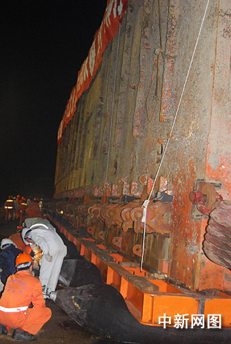 “南海一號”原本計劃今晚拖至岸上,并拉移至“水晶宮”中。在現(xiàn)場,記者看到,工作人員利用16個氣囊墊在“南海一號”下進行拖移。每個氣囊直徑一米,能承受五百噸的壓力。在拖移過程中,工作人員必須不斷調(diào)整氣囊位置,但顯然難度不小。在工作進行到十點半左右時,有關(guān)方面決定暫停拖移。