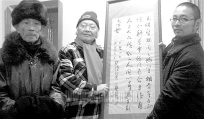 昨日下午,記者來到兩位老人家里,見老人們的兒女攙扶著兩位老人,拿出了跟隨他們夫妻60余年的郭老真跡。四川省博物館副館長魏學峰接過捐贈的書法后,向老人頒發(fā)了《文物征集獎勵證書》,并表示感謝。