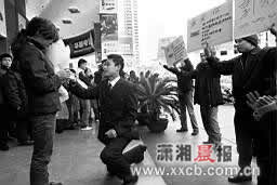 據(jù)其中一名穿著筆挺的深藍(lán)色西裝、系著領(lǐng)帶的男子介紹,他叫卓曉勇,張家界人,今年29歲,在長(zhǎng)沙五里牌一家公司做事。3年前,通過(guò)朋友介紹,他認(rèn)識(shí)了女友——中國(guó)移動(dòng)通信小吳門(mén)通信店的營(yíng)業(yè)員郭彩霞,但雙方關(guān)系一直沒(méi)有到談婚論嫁的地步,由于父母親催得急,考慮到元旦是一元復(fù)始、萬(wàn)象更新的日子,他想爭(zhēng)取在新年第一天,贏得芳心,抱得美人歸。