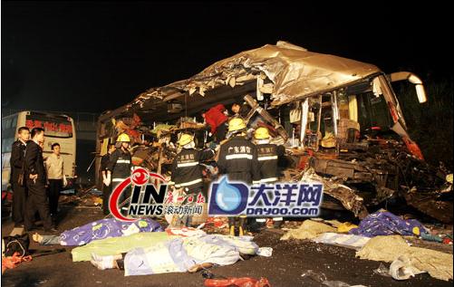 今天凌晨1點(diǎn)40分左右,渝湛高速洋青路段發(fā)生特大交通事故,一輛深圳開往南寧(桂A18716)的臥鋪客車追尾撞上一輛新奧燃?xì)獾蜏匾后w運(yùn)輸半掛車后,沖過中間防護(hù)欄狂奔三十多米,迎面和另一輛貴陽(yáng)開往珠海(粵C50821)的臥鋪客車相撞,當(dāng)場(chǎng)造成十人死亡七人重傷。目前事故原因正在進(jìn)一步調(diào)查中。