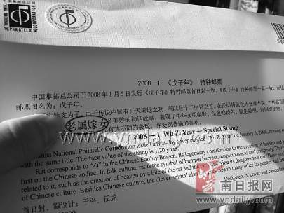 記者隨后來到楚雄集郵經(jīng)營部,花了2.2元也購買了一枚《戊子年》特種郵票首日封。該套首日封編號為2008-1,印量30萬枚,封上還加貼了中國集郵總公司的防偽標簽。當記者向工作人員詢問首日封文字中出現(xiàn)的錯誤時,這位工作人員顯然完全不知情,經(jīng)提醒看到后,她連連表示,這樣的情況以前從未發(fā)生過,這還是頭一次碰到。她隨即拿出和首日封一起配套發(fā)行的一套鼠年郵票仔細查看,記者注意到,上面有首日封設(shè)計者于平和任憑的介紹,并且在多處出現(xiàn)了“老鼠嫁女”的字樣,但并無任何差錯。據(jù)工作人員介紹,首日封在楚雄的發(fā)行量僅70枚,目前已銷售了近40枚。(王維娜 攝影報道)