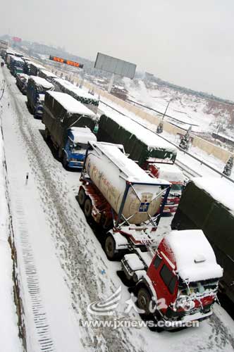 1月13日,九江下起了近10年來(lái)最大的一場(chǎng)雪。這場(chǎng)大雪造成九江長(zhǎng)江大橋交通堵塞。因?yàn)闃蛎娼Y(jié)冰打滑還引發(fā)幾起小的交通事故。為了安全起見(jiàn),九江交警部門立即實(shí)施“封橋”,逾萬(wàn)輛車停滯在九江市境內(nèi)。武警九江支隊(duì)出動(dòng)百名官兵,緊急疏通被阻交通。