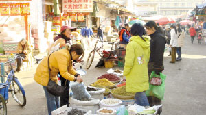 農(nóng)貿(mào)市場上小商販用編織袋給消費(fèi)者裝東西