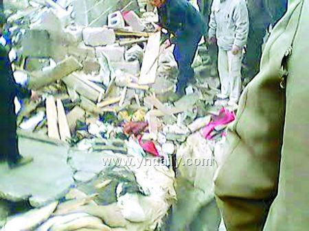 “嘭”的一聲巨響,木板、竹竿、瓦礫、水泥渣四處橫飛,嗆人的火藥味中,帶血的斷手?jǐn)嗄_散落在地……昨日上午10時30分,昭通市鎮(zhèn)雄縣果珠鄉(xiāng)果珠村街上社拱橋村民小組,一家庭式土制爆竹作坊,在用火藥生產(chǎn)爆竹過程中,發(fā)生爆炸,作坊主人劉龍春及其舅子、丈母娘不幸被炸得血肉模糊,當(dāng)場身亡,劉龍春的媳婦和四哥傷勢嚴(yán)重,被及時送到醫(yī)院救治。事發(fā)后,當(dāng)?shù)乜h、鄉(xiāng)兩級政府及有關(guān)部門迅速趕到現(xiàn)場,指揮人員排除二次爆炸隱患。